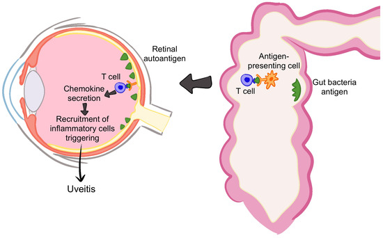 In the context of uveitis, gut microbiome antigens may play a role in the development of autoreactive T cells through antigen mimicry [41,42] (Figure 3). These autoreactive T cells can cross the blood–retina or blood–aqueous barrier, entering the eye and triggering intraocular inflammation [42]. Studies using animal models, such as mice with experimental autoimmune uveitis (EAU), have shown that disruption of the microbiota through antibiotics reduces uveitis severity and intestinal Th17 activation [43]. Furthermore, transferring T cells from microbiota-exposed mice to wild-type mice can induce uveitis, suggesting that microbial interactions contribute significantly to disease pathogenesis [43].