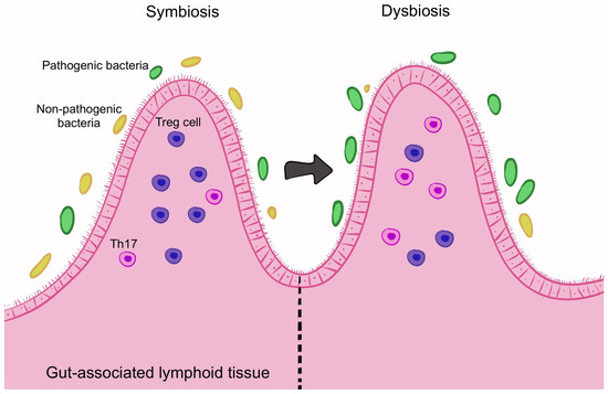 The gut microbiota regulates the balance between pro-inflammatory Th17 cells and Treg cells. Dysbiosis can increase Th17 cells and decrease Treg cells, triggering inflammation. Image created with Procreate, Savage Interactive Pty Ltd., Version History: 5.3.5.