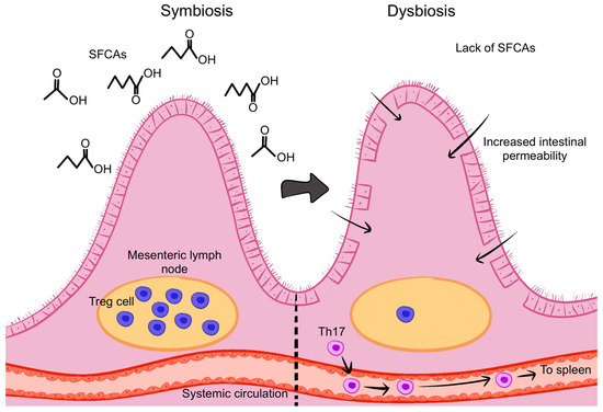 Gut microbes produce thousands of metabolites, with short-chain fatty acids (SCFAs) like butyrate, propionate, and acetate being the most common. These are byproducts of fiber fermentation by gut microbiota [41]. SCFAs play a crucial role in maintaining intestinal barrier integrity, promoting Treg cell populations in colonic lymph nodes, and limiting the movement of Th17 cells to the spleen [41,48] (Figure 5).