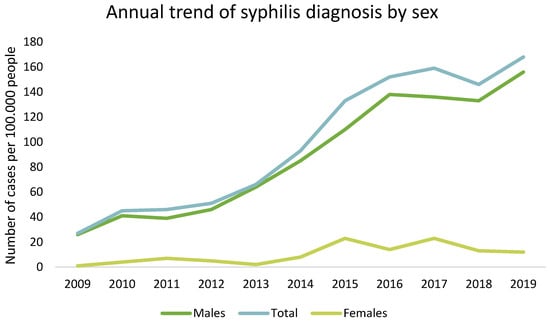 Trend of syphilis cases over the study period. This line graph illustrates the annual number of syphilis cases diagnosed per sex, highlighting the upward trend and identifying peak years of diagnosis.