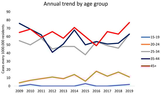 Line graph illustrating the yearly number of syphilis cases per age group.