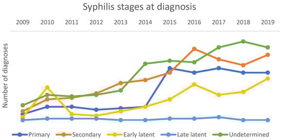 Trends in the stages of presentation at diagnosis for the entire population regardless of sex and sexuality, Bologna STD Centre, period 2009–2019.