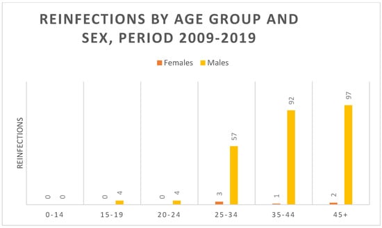 Reinfection rates accounted for 23.7% of all cases throughout the study period. Males represent the most significant category, with 250 cases making up 97.3% of the total. Specifically, MSM were disproportionately represented in reinfection statistics. Geographically, most reinfected patients (91%) were Italian. Considering males and females, the age group most subject to reinfection was the over-45s, representing over 38.5% of reinfected patients (Figure 5).