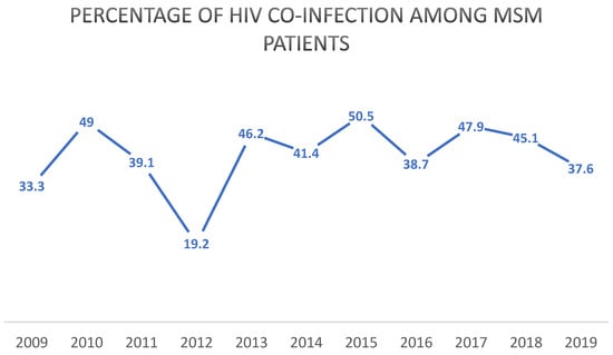 Moreover, the period analysed, 2009–2019, captures the dynamics of syphilis transmission in the pre-COVID-19 era, which saw an increase in high-risk behaviours. It also coincides with the advent of Pre-Exposure Prophylaxis (PrEP) in Italy, a potential factor influencing syphilis trends in certain populations. By conducting this decade-long analysis at a metropolitan STD centre, we also intend to compare local data with national and European statistics, focusing on patterns in syphilis prevalence, incidence, and reinfection with special attention given to high-risk groups, particularly MSM [,,,], who are known to be disproportionately affected by this STI. The analysis includes trends in new diagnoses, rates of reinfection, and co-infections, particularly with HIV, which complicates the clinical management and epidemiological tracking of syphilis.