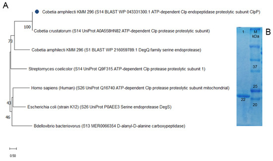 Protein structure analysis and molecular weight of the C. amphilecti KMM 296 protease CamClpP: (A) Phylogenetic tree based on the analysis of CamClpP protein sequences and closest relatives using maximum likelihood and JTT matrix-based model (MEGA11); (B) SDS-PAGE of the purified recombinant protein CamClpP (line 1); M-molecular weight marker (Bio-Rad).
