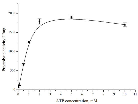 To confirm the dependence of CamClpP on the presence of ATP, adenosine triphosphate was added to the incubation mixture at different concentrations from 0 to 10 mM (Figure 2). The enzyme activity increased sharply at ATP concentrations up to 2 mM, but when the ATP concentration increased from 2 to 10 mM, the protease activity no longer changed.