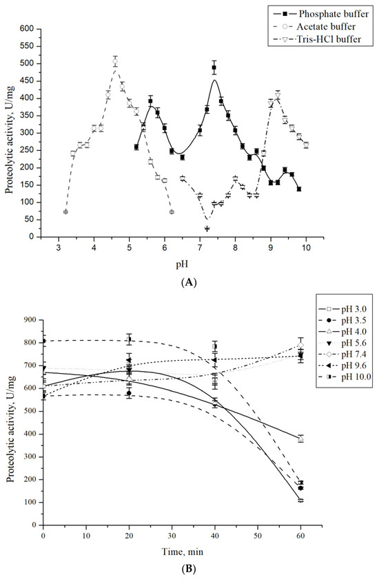 The determination of the optimum pH for CamClpP activity was studied in the range of pH 3.2–10.0, using 1% casein as a substrate [15]. The following buffer solutions were used in the experiment: 100 mM sodium acetate (pH 3.2–6.2); 100 mM Tris-HCl (pH 6.0–10.0); and 100 mM sodium phosphate buffer (pH 5.0–10.0). Stability at different pH values was tested by incubating the enzyme in 100 mM acetate buffer at pH values of 3.0, 3.5, and 4 and in 100 mM sodium phosphate buffer at pH values of 5.6, 7.4, 9.6, and 10.0, supplemented with 0.5 mM ATP and 0.3 M NaCl for 0, 20, 40, and 60 min; then, 1% casein was added, and the caseinolytic activity was determined as described above.