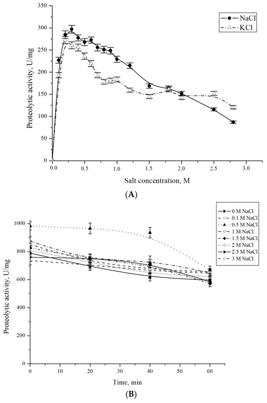 In addition, the protease CamClpP from C. amphilecti KMM 296 was a relatively salt-tolerant enzyme, retaining a third of its activity at NaCl and KCl concentrations up to 2.8 M, with the optimum values at 0.3 M and 0.2 M, respectively (Figure 4A). Halotolerant proteases from marine bacteria of the genus Bacillus have been also described as requiring NaCl salt at concentrations of 1.5–2.5 M to function [19,31,32].