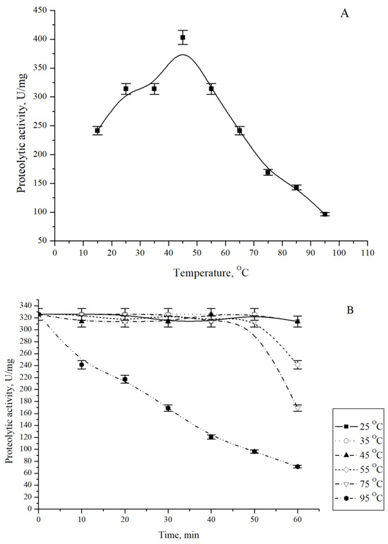 The effect of temperature on CamClpP activity was determined by incubating the standard incubation mixture at the temperatures ranging from 15 to 65 °C at the intervals 5–10 °C [16]. Temperature stability was determined by the pre-incubation of a solution of CamClpP in 50 mM Tris-HCl buffer (pH 8.0) at different temperatures for 0, 10, 20, 30, 40, 50, and 60 min; then, 1% casein was added to determine the proteolytic activity of the enzyme by the standard assay method, as described above.