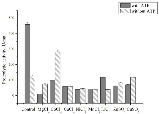 However, Co2+ had a comparatively lower inhibitory effect on CamClpP, which coincides with the Co2+ preference of many enzymes from C. amphilecti KMM 296, indicating a strain-specific adaptation feature to a high cobalt concentration in the environment [11,53]. Moreover, cobalt ions activated the enzyme in the absence of ATP (Figure 6). ATP and bivalent metal ions probably concurrently bind the same allosteric regulation site of CamClpP. The low-molecular-weight inhibitors of the Clp protease active site have been found to drastically up-regulate the activity of these allosteric enzymes [5,6,7].