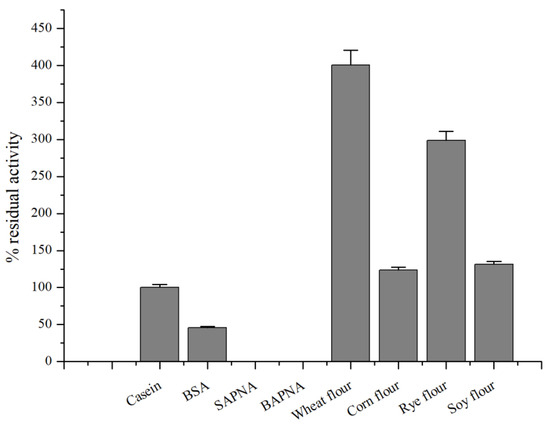 The substrate specificity of the protease was determined using the synthetic substrates α-benzoyl-Arg-p-nitroanilide (BAPNA) and N-succinyl-L-alanyl-L-alanyl-L-prolyl-L-phenylalanine-4-nitroanilide (SAPNA) (Sigma Aldrich, St. Louis, MO, USA) and natural substrates, such as casein and bovine serum albumin (Sigma). The high-polymer substrates, such as maize, rye, wheat, and soya grains, were purchased from a local market.