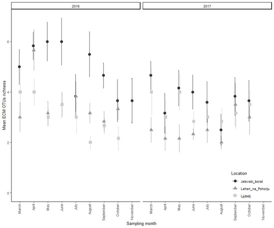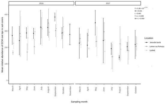 | Jelovški boršt | Sampling month × factor (Sampling year) | 0.00173 ** | 0.00299 ** | 0.00545 ** |