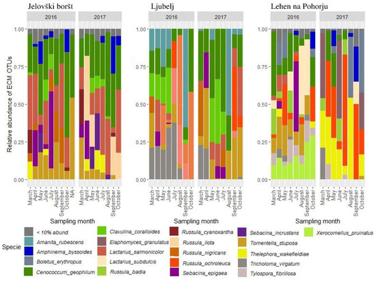 - Mrak, T.; Hukić, E.; Štraus, I.; Unuk Nahberger, T.; Kraigher, H. Ectomycorrhizal community composition of organic and mineral soil horizons in silver fir (Abies alba Mill.) stands. Mycorrhiza 2020, 30, 541–553. [Google Scholar] [CrossRef]