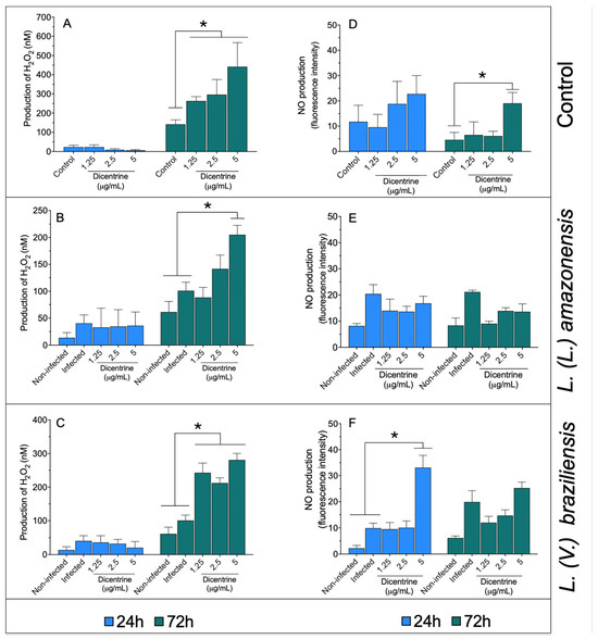 Infected and noninfected bone marrow-differentiated macrophages were treated with 1.25, 2.5, and 5 μg/mL of dicentrine purified from O. puberula leaves for 24 and 72 h, when H2O2 (A–C) and NO (D–F) levels were quantified. * p < 0.05 in comparison to controls.