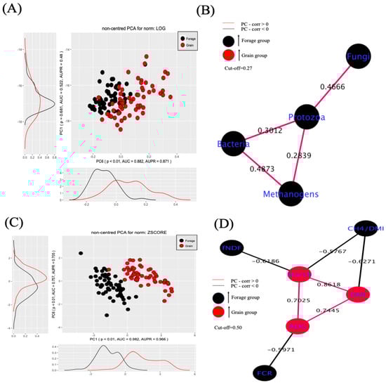 The relationship between rumen microbial abundance (bacteria, protozoa, fungi, and archaea) and phenotypic traits (DMI, NDF intake, starch intake, CH4/kg DMI, FCR, and ADG) was explored through unsupervised preliminary analysis with Principal Components (PCA) using the package mixOmics []. Then, we implemented the algorithm PC-Corr—Principal Component-Correlation []—to generate discriminative functional networks for class labels (forage vs. grain) using p-values of Mann–Whitney tests as evaluators. Features were normalized through z-score (centered to have mean 0 and scaled to have standard deviation 1) or log (logarithm base 10 plus 1 applied to each data element to avoid problems with 0 values) before building PC-Corr networks in Cytoscape 3.6.0 [].