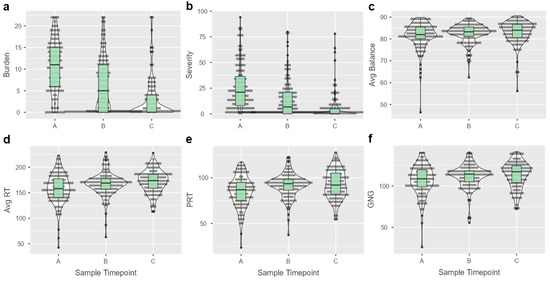 Symptoms, balance, and neurocognition change across follow-up timepoints. The violin and box plots display changes in (a) symptom burden, (b) symptom severity, (c) average (avg) balance score, (d) avg reaction time (RT), (e) procedural reaction time (PRT), and (f) go/no-go (GNG) performance across three timepoints for 118 individuals with concussion. All the measures displayed significant changes (p < 0.05) from enrollment (A, 4.5 days post-injury) to the first (B, 11.7 days post-injury) and second (C, 30.1 days post-injury) follow-up visits on nonparametric repeated-measures ANOVA.