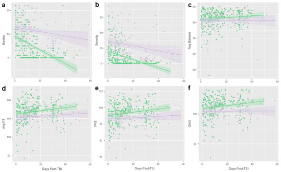 Symptoms, balance, and neurocognition differ between PPCS and non-PPCS groups across follow-up timepoints. Scatter plots and trend lines display changes over time (days post-traumatic brain injury; TBI) for 30 participants with PPCSs (purple) and 88 participants without PPCSs (green). Interactions between PPCS group and time post-injury displayed a significant effect on (a) symptom burden, (b) symptom severity, (c) average (avg) balance score, (d) avg reaction time (RT), (e) procedural reaction time (PRT), and (f) go/no-go (GNG) performance on linear regression analysis.