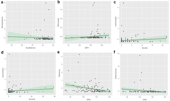 There were no microbial genera with significantly different (adj. p < 0.05) activity between the PPCS and non-PPCS groups at enrollment or the two follow-up visits (Table S2). A total of 8 microbial genera displayed nominal differences at enrollment, 11 displayed nominal differences at the first follow-up, and 11 displayed nominal differences at the second follow-up, but none survived multiple testing correction. Among all the participants at enrollment (4.5 days post-injury), balance was associated with Brevibacterium activity (Spearman’s R = −0.32 and adj. p = 0.043; Figure 3a), and simple reaction time was associated with Microcystis activity (Spearman’s R = 0.29 and adj. p = 0.044; Figure 3b). Symptom burden, symptom severity, procedural reaction time, and go/no-go performance did not display a relationship with microbial activity at enrollment. Among all the participants at the second follow-up (30.1 days post-injury), symptom burden was associated with Luconostoc activity (Spearman’s R = 0.31 and adj. p = 0.026; Figure 3c), and symptom severity was associated with Luconostoc activity (Spearman’s R = 0.32 and adj. p = 0.012; Figure 3d). Go/no-go performance was associated with Pelosinus activity (Spearman’s R = −0.33 and adj. p = 0.010; Figure 3e) and Enterococcus activity (Spearman’s R = −0.31 and adj. p = 0.020; Figure 3f). Balance, simple reaction time, and procedural reaction time did not display a relationship with microbial activity at the second follow-up.