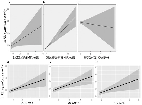 A model controlling for participant age and sex (AIC = 2892 and conditional R2 = 0.437) demonstrated a significant longitudinal relationship between symptom burden and activity of Lactobacillus (F = 5.47 and adj. p = 0.020), Saccharomyces (F = 6.79 and adj. p = 0.020), and Micrococcus (F = 7.94 and adj. p = 0.015) (Figure 4a–c). Increased levels of Lactobacillus and Saccharomyces were associated with higher symptoms, whereas elevated levels of Micrococcus were associated with reduced symptoms. An additional model employing KO elements (AIC = 2821 and conditional R2 = 0.642) demonstrated a relationship between longitudinal symptoms and three KO elements. K00867 (coaA, type I pantothenate kinase, F = 8.21, and p = 0.015), K00703 (glgA, starch synthase, F = 4.48, and p = 0.035), and K00974 (cca, tRNA nucleotidyltransferase, F = 7.11, and adj. p = 0.016) were all associated with higher symptom burden, after controlling for age, sex, and days since injury (Figure 4d,e).