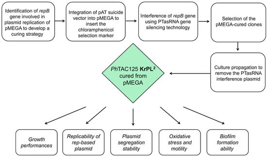 In this study, we explored the genomic and transcriptomic landscape of the pMEGA plasmid to build a finely tuned strategy tailored to its curing. We developed a sequential genetic scheme through the combination of two different genetic methodologies previously developed in PhTAC125. We first edited pMEGA by integrating the pAT suicide vector carrying a selection marker, necessary to distinguish wild-type from cured bacteria. Then, we used PTasRNA gene-silencing technology to target and interfere with the replication machinery of the plasmid. We successfully removed the pMEGA plasmid from the bacterium, which resulted in the construction of a novel strain named KrPL2 (Figure 1). The phenotypical characterization showed that this strain exhibited comparable growth dynamics to its progenitor strain, demonstrating that the removal of pMEGA did not significantly impact the strain growth or survival across different temperatures and media conditions. Additionally, plasmids that share similarities in their replication or partitioning systems cannot stably coexist in the same bacterial cell, leading to plasmid incompatibility []. Hence, further evaluations of plasmid replicability, stability, and copy number revealed that, despite the removal of pMEGA, the inability of rep-based plasmids to replicate persisted, indicating the involvement of additional mechanisms beyond replication-associated genes. This study also confirmed that the removal of pMEGA did not affect the pMtBL-derived plasmid stability or copy number under the conditions tested. Also, this work demonstrates the efficacy of PTasRNA technology in curing plasmids with rolling-circle replication, extending the application of this methodology for future applications in genetic manipulation and functional studies in psychrophilic bacteria.