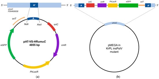The first step was designed to introduce the chloramphenicol selection marker within pMEGA, developing a novel mutant strain of PhTAC125, named KrPL insPolV. Construction of the KrPL insPolV mutant was carried out by exploiting the pAT non-replicating plasmid (suicide vector, pAT-VS-HRumuC) to introduce the chloramphenicol resistance gene (cmR) into pMEGA. Also, the suicide vector comprises the 259 bp homology region of the umuC gene (HRumuC), which is a fragment of the PSHA_00030 gene located on pMEGA (named A in Figure 2a) and the gene of eGFP under the placZ promoter (optimized for PhTAC125). Homology recombination requires the mobilization of the suicide vector pAT-VS-HRumuC to the host cell PhTAC125 KrPL, a strain devoid of the pMtBL plasmid [], by intergeneric conjugation harnessing the E. coli S17-1 λpir strain [,,] as the donor. This procedure allows for the recombination event in which pAT-VS-HRumuC inserts into the pMEGA plasmid in correspondence with the homology region (Figure 2b).