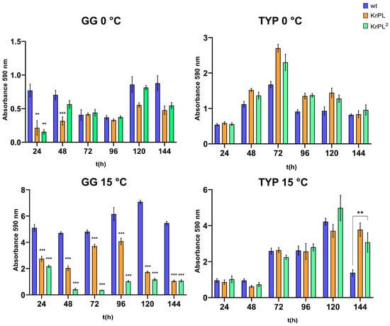 The kinetics of biofilm formation were carried out for 24, 48, 72, 96, 120, and 144 h. As shown in Figure 3, the kinetics of biofilm formation showed different patterns in KrPL2, wt, and KrPL at 15 °C in GG 5-5. Indeed, both KrPL and KrPL2 were not able to accumulate biofilm when grown in GG 5-5 medium at 15 °C after 24 h, though this was possible for wt. Furthermore, while KrPL biofilm accumulation gradually decreased over time, with a lower peak of accumulation at 144 h, KrPL2 showed a reduced ability to produce biofilm already after 48 h, which lasted until 144 h. KrPL and KrPL2 also showed differences in the production of biofilm in GG 5-5 medium at 0 °C after 24 and 48 h. However, after 48 h, differences between wt, KrPL, and KrPL2 were not evident.