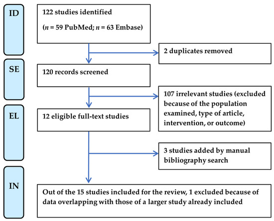The PRISMA flow chart of the systematic literature review selection is shown in Figure 1. Starting from a total of 122 publications from PubMed and Embase, most of the articles were excluded because of the type of article (i.e., abstract, editorial, book chapter, or review) and intervention. Only one article was excluded due to the type of patient population investigated as the diagnosis of SFN was performed before COVID-19 onset [24]. Next, three papers were added by manual search [13,14,16] because they cited the articles initially selected. Of the fifteen studies selected, we finally eliminated another one because it reported data from a cohort of patients partly overlapping with those of another larger study already included [21,25].
