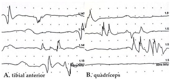 Motor unit action potential (MUAP) abnormalities in EMGs accompanying SFN were described only by Bandinelli et al., showing a short duration, small amplitude, and polyphasic aspect, without the spontaneous activity of positive sharp waves and fibrillations [14] (Figure 3).