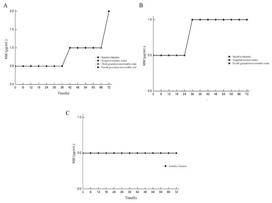 The MIC values of drug-resistant bacteria in various states at different doses and at different times were compared with those of standard strains. All strains were assigned to two categories, and the induced strains were preliminarily classified. Under the 2 μg/mL/12 h dose model, drug-resistant bacteria with MIC values equal to those of the standard strains were screened at 6–36 h, while drug-resistant bacteria with MIC values greater than those of the standard strains were screened at 42–72 h, and only the drug-resistant bacteria at 66 h and 72 h could recover their drug sensitivity (Figure 2A). In the 3 μg/mL/12 h dose model, drug-resistant bacteria with MIC values equal to those of the standard strains were screened from 6 to 24 h, and drug-resistant bacteria with MIC values greater than those of the standard strains were screened from 30 to 72 h. Only the drug-resistant bacteria at 60 h and 66 h could recover their sensitivity to the drug (Figure 2B). For the 5 μg/mL/12 h dose model, all the MIC values of the bacteria were equal to those of the standard strains (Figure 2C). In the determination of sensitivity recovery, the strains with unrecoverable resistance through successive generations were named as “acquired resistant strains”. For the strains whose resistance could be recovered through continuous passage, the intensity of resistance was determined, and they were referred to as “adaptive resistant strains with different resistance strengths”. Under the condition of the 2 μg/mL/12 h dose model, the strains obtained at 66 h and 72 h were the 2MIC and 4MIC adaptive resistant strains, respectively. Under the condition of the 3 μg/mL/12 h dose model, the strains obtained at 60 h and 66 h were the 2MIC and 2MIC adaptive resistant strains, respectively.