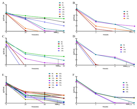 When the MDK99 value of a strain was greater than that of the standard strain, it was considered a “tolerant” adaptive drug-resistant bacterial strain. The strains with values greater than the standard strain MDK99.99 were considered “persistent” adaptive drug-resistant bacteria. Strains with MDK99.99 values lower than that of the standard strain are referred to as “drug-sensitive strains”. In the 2 μg/mL/12 h dose model, the “tolerant” adaptive drug-resistant bacteria were screened initially and were obtained at 12, 24, and 36 h (Figure 3A). The “persistent” adaptive drug-resistant bacteria were screened at 18 h (Figure 3B). In the 3 μg/mL/12 h dose model, the “tolerant” adaptive drug-resistant bacteria were initially obtained at 12 h (Figure 3C), followed by “persistent” adaptive drug-resistant bacteria at 18 h (Figure 3D). In the 5 μg/mL/12 h dose model, “tolerant” adaptive drug-resistant bacteria were first screened at 6, 12, 30, 36, 54, 60, 66, and 72 h (Figure 3E), and “persistent” adaptive drug-resistant bacteria were screened at 42 h and 48 h (Figure 3F).