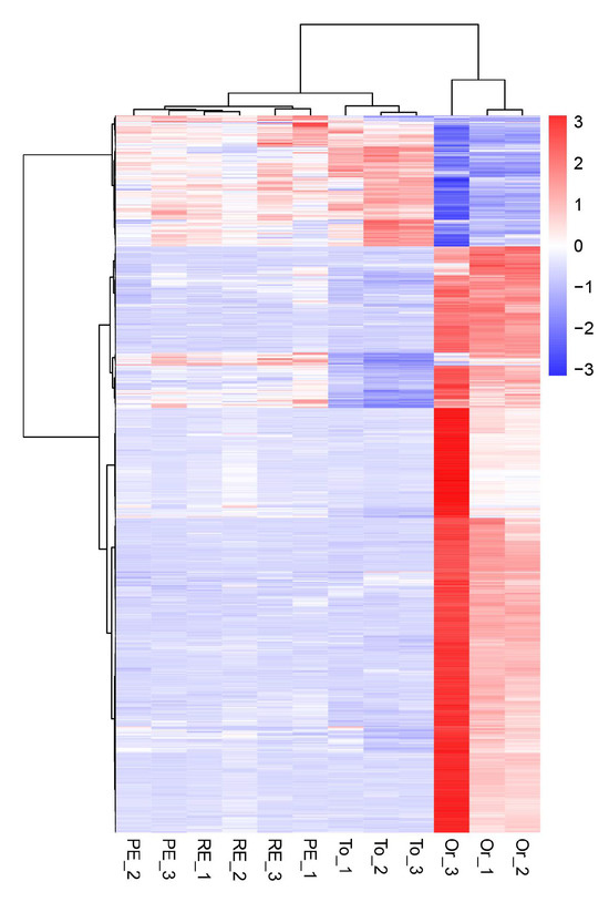 Differentially expressed genes were identified using the criteria of an absolute value of log FC > 1 and a p-value < 0.05. The results are shown in Figure 4. There were 58 upregulated genes and 705 downregulated genes in the PE and OR groups (Figure 4A). There were 67 differentially upregulated genes between the RE and OR groups and 665 differentially downregulated genes (Figure 4B). There were eight differentially upregulated genes and no differentially downregulated genes between the RE and PE groups (Figure 4C). There were 176 differentially upregulated genes and 764 differentially downregulated genes between the TO and OR groups (Figure 4D). Between the TO group and the PE group, there was one differentially upregulated gene and 74 differentially downregulated genes (Figure 4E). Between the TO group and the RE group, there was one differentially upregulated gene and 87 differentially downregulated genes (Figure 4F). There were significant differences between the three experimental groups and the original group.