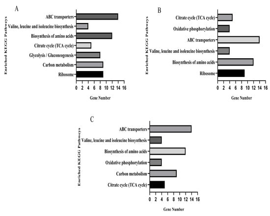 The KEGG database was used for pathway enrichment analysis for differentially expressed genes. After KO annotation of the genes, there were seven significantly enriched pathways in the TO and OR groups (Figure 7A), six significantly enriched pathways in the PE and OR groups (Figure 7B), and six significantly enriched pathways in the RE and OR groups (Figure 7C). The gene expression pathways of the three groups of drug-resistant bacteria with different states were involved in the biosynthesis of amino acids, ABC transporters, valine, leucine, and isoleucine and in the citrate cycle (TCA cycle).