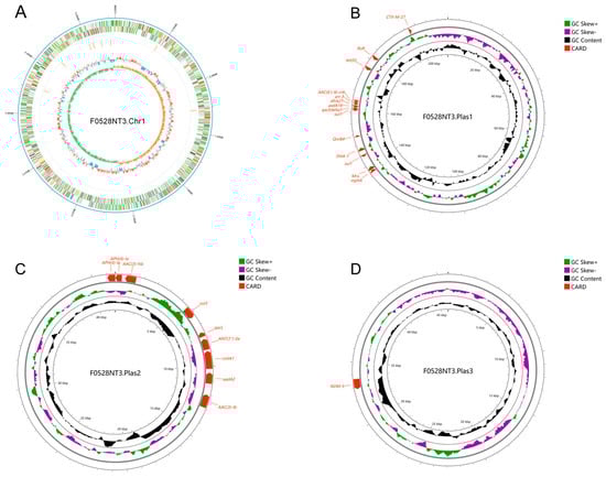 Plasmid pF0528NT3.Plas1, with a total length of 211,697 bp, exhibits a dual-replicon phenotype, belonging to both the IncFIB and IncFII types. This plasmid encapsulates a diverse array of resistance genes, such as blaCTX-M-27, floR, tet(D), AAC(6′)-Ib-cr6, and blaDHA-1, further contributing to the strain’s antibiotic resistance profile. Then, Plasmid pF0528NT3.Plas2, measuring 41,604 bp in length, is classified as IncR type and carries resistance genes APH(4)-Ia, AAC(3)-IVa, sul3, and qacL, adding another layer of complexity to the strain’s resistance mechanisms. Lastly, Plasmid pF0528NT3.Plas3, with a total length of 45,829 bp, belongs to the IncX3 type and harbors the potent blaNDM-5 resistance gene, emphasizing the strain’s capacity to resist even the most advanced antibiotics (Table S3).