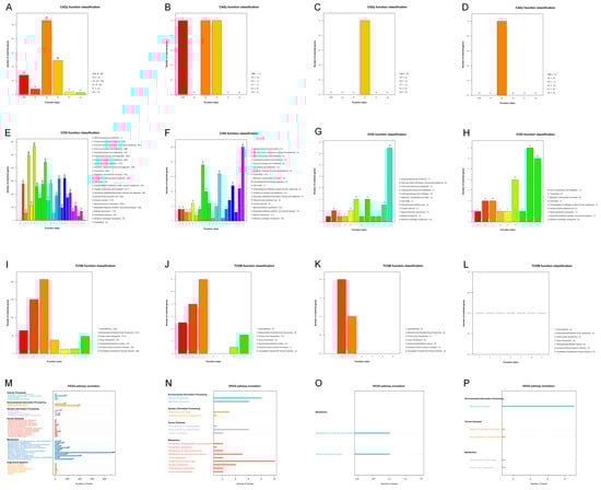 The annotation of functional genes in K. pneumoniae FO528NT3. (A) The Carbohydrate-Active enZYmes Database (CAZy) function classification of the chromosome in K. pneumoniae FO528NT3; (B) The CAZy function classification of pF0528NT3.Plas1 carried by K. pneumoniae F0528NT3; (C) The CAZy function classification of pF0528NT3.Plas2 carried by K. pneumoniae F0528NT3; (D) The CAZy function classification of pF0528NT3.Plas3 carried by K. pneumoniae F0528NT3; (E) The Cluster of Orthologous Groups of proteins (COG) function classification of the chromosome in K. pneumoniae FO528NT3; (F) The COG function classification of pF0528NT3.Plas1 carried by K. pneumoniae F0528NT3; (G) The COG function classification of pF0528NT3.Plas2 carried by K. pneumoniae F0528NT3; (H) The COG function classification of pF0528NT3.Plas3 carried by K. pneumoniae F0528NT3; (I) The Transporter Classification Database (TCDB) function classification of the chromosome in K. pneumoniae FO528NT3; (J) The TCDB function classification of pF0528NT3.Plas1 carried by K. pneumoniae F0528NT3; (K) The TCDB function classification of pF0528NT3.Plas2 carried by K. pneumoniae F0528NT3; (L) The TCDB function classification of pF0528NT3.Plas3 carried by K. pneumoniae F0528NT3; (M) The Kyoto Encyclopedia of Genes and Genomes (KEGG) pathway annotation of the chromosome in K. pneumoniae FO528NT3; (N) The KEGG pathway annotation of pF0528NT3.Plas1 carried by K. pneumoniae F0528NT3; (O) The KEGG pathway annotation of pF0528NT3.Plas2 carried by K. pneumoniae F0528NT3; (P) The KEGG pathway annotation of pF0528NT3.Plas3 carried by K. pneumoniae F0528NT3.