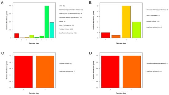 Annotation in the Pathogen-Host Interactions database (PHI) for K. pneumoniae FO528NT3. (A) The PHI phenotype classification of the chromosome in K. pneumoniae FO528NT3; (B) The PHI phenotype classification of pF0528NT3.Plas1 carried by K. pneumoniae F0528NT3; (C) The PHI phenotype classification of pF0528NT3.Plas2 carried by K. pneumoniae F0528NT3; (D) The PHI phenotype classification of pF0528NT3.Plas3 carried by K. pneumoniae F0528NT3.