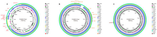 The circular comparison diagram of plasmid genomes carried by K. pneumoniae FO528NT3. (A) In comparing plasmid pF0528NT3.Plas1 with other similar plasmids, it is noted that pF0528NT3.Plas1 serves as the reference plasmid. Each circle, from the innermost to the outermost, represents a different plasmid as follows: CP006657.1, CP020838.1, CP023943.1, CP109705.1, CP142990.1 and pF0528NT3.Plas1 (this study). (B) In comparing plasmid pF0528NT3.Plas1 with other similar plasmids, it is noted that pF0528NT3.Plas2 serves as the reference plasmid. Each circle, from the innermost to the outermost, represents a different plasmid as follows: CP101557.1, CP155649.1, OW969795.1, OW969851.1, OW969863.1 and pF0528NT3.Plas2 (this study). (C) Comparison of blaNDM-5-carrying plasmid pF0528NT3.Plas3 with other similar plasmids. Plasmid pF0528NT3.Plas1 is a reference plasmid. Each circle represents a different plasmid as follows (from inside to outside): CP014006.1, CP021759.1, CP064177.1, CP102896.1, CP106910.1 and pF0528NT3.Plas3 (this study).