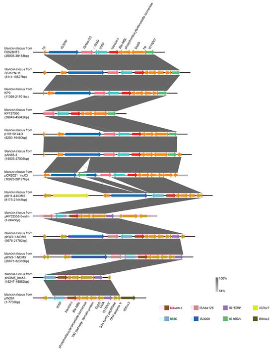 Upon conducting a thorough search of the NCBI database for K. pneumoniae strains harboring the blaNDM-5 resistant gene (Table S4), we performed a detailed linear alignment of the upstream and downstream flanking regions of the blaNDM-5 gene in 12 such strains with the corresponding regions of the blaNDM-5 gene locus in pF0528NT3.Plas3 (Figure 6). Our analysis revealed that the IS5D-blaNDM-5-Ble-MBL-PRAI gene cassette is remarkably conserved among K. pneumoniae strains. Furthermore, we observed a recurrent presence of ISAba125 and IS3000 insertion sequences upstream of this conserved gene cassette, highlighting their potential role in the dissemination and stability of the blaNDM-5 resistance determinant.