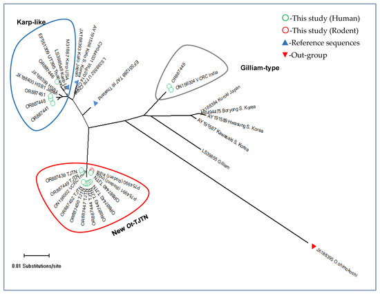 - Prakash, J.A.; Kamarasu, K.; Samuel, P.P.; Govindarajan, R.; Govindasamy, P.; Johnson, L.A.; Ramalingam, P.; Nirmalson, J.; Seran, K.C. Detection of Orientia tsutsugamushi in Novel Trombiculid Mite Species in Northern Tamil Nadu, India: Use of Targeting the Multicopy traD Gene. J. Med. Entomol. 2022, 59, 693–699. [Google Scholar] [CrossRef] [PubMed]