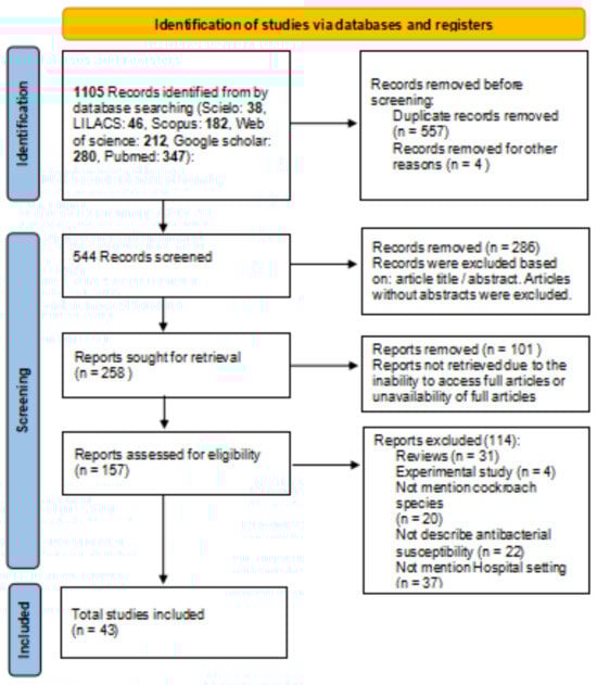 A systematic review of pathogens of medical importance isolated from cockroaches collected in hospitals in different parts of the world over a 25-year period was performed. A literature search strategy similar to that used by other authors in reviews of isolated fly, cockroach, and beetle pathogens was established for the selection of studies [56,57]. This allowed a thorough process of identification, screening, and selection of articles based on the inclusion and exclusion criteria proposed by these authors.