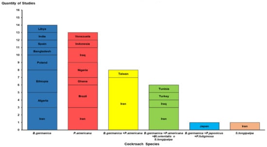 B. germanica and P. americana were the predominant cockroach species in the studies included in this review [6,11,12,13,14,15,16,18,19,20,22,23,24,25,26,27,28,29,30,31,32,33,34,35,36,37,38,39,40,41,42,43,44,45,46,47,48,49,50,51,53,54]. Both are recognized as the most abundant of this group of insects worldwide [1,4,7]. Trade and the ability of both species to adapt to a wide range of conditions have played a key role in their distribution [1,2,4]. Bl. orientalis, P. fuliginosa, P. japonica, and S. longipalpa are other species considered to be of medical importance with limited worldwide distribution reported in the articles reviewed [1,2,18,48,52].