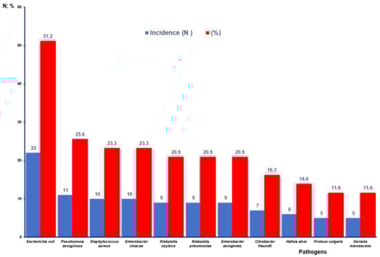 The bacteria that most frequently cause infections in hospitalized patients include S. aureus, Streptococcus sp., Acinetobacter sp., S. coagulase negative, P. aeruginosa, E. coli, Proteus mirabilis, and K. pneumoniae. Some of these bacteria represent a global threat due to their increasing resistance to available antibiotics and their role in transmitting such resistance between bacteria of the same and different species [18,19,20].