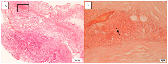 Figure 2. (A). H&E section ×10 (B). The area from the rectangle in (A) as seen in a Gram stain. The arrow points to Gram-positive cocci ×100. Taken on the Leica DMR microscope with Nikon Digital Sight DS-5Mc-U1 cooled colour camera.