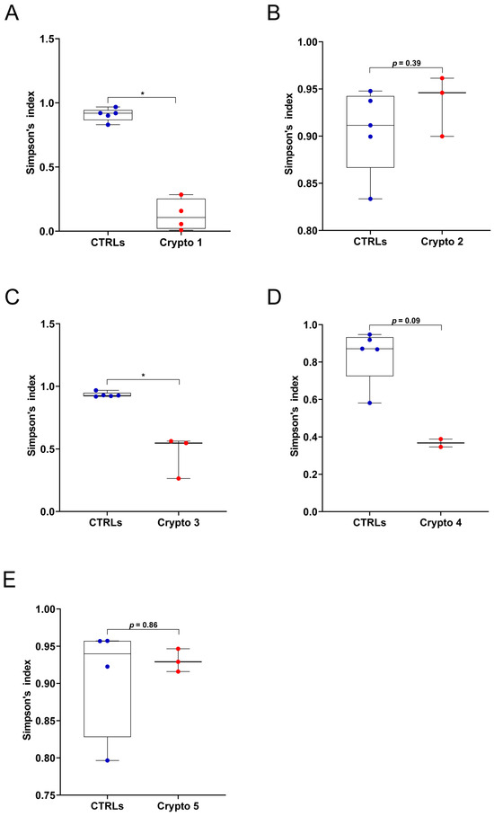 GM alpha-diversity in patients with mild and moderate–severe Cryptosporidium infections. (A–E) Alpha-diversity, as measured by Simpson’s index, in Crypto 1 (A), Crypto 2 (B), Crypto 3 (C), Crypto 4 (D) and Crypto 5 (E), compared to age-matched CTRLs. Statistical analysis: Mann–Whitney U-test, * p < 0.05. Patients with moderate to severe cryptosporidiosis (A,C,D) were characterized by a reduction in alpha-diversity measurements, while mildly affected patients (B,E) had comparable alpha-diversity measurements compared to age-matched CTRLs. In red: individual Cryptosporidium-positive replicates. In blue: individual CTRL replicates.