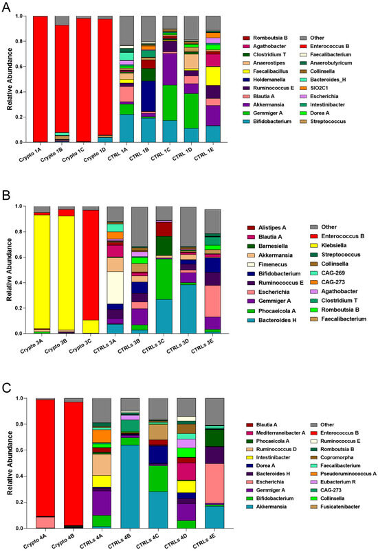 We next compared patient GM metataxonomic profiles to CTRL subjects, starting with those patients who presented with moderate–severe cryptosporidiosis. We found that, in all samples profiled from moderately–severely affected patients, one single bacterial genus predominated in the GM, with relative abundances of close to or over 90% (Figure 2). We found that Crypto 1 samples were predominantly composed of Enterococcus spp., composing between 84 and 98% of the total GM of this patient (Figure 2A), followed by Bacteroides H and Streptococcus. In two Crypto 3 samples, we found an overwhelming predominance of Klebsiella (Figure 2B) which, after sample collection, would also be diagnosed systemically in this patient. However, similar to Crypto 1, we also found a large relative abundance of Enterococcus spp. in one out of the three replicates, which was almost completely absent in CTRLs (Figure 2B). Interestingly, Crypto 4 were also found to be predominantly composed of Enterococcus spp., consistent with the results observed in Crypto 1 and Crypto 3 (Figure 2C), and despite having yet another kind of underlying immunodeficiency, and despite not having been treated with antibiotics, as the other two moderate–severely affected patients were (Table 1). The GM of age-matched CTRLs, on the other hand, were far more diverse, and were primarily composed of Bifidobacterium spp., Gemmiger spp., Akkermansia spp., and Blautia spp. (Figure 2A). These results largely explain the reduced alpha-diversity measurements illustrated in Figure 1. Taken together, these results seem to suggest that an overabundance of Enterococcus spp. is a common GM signature in patients with moderate to severe Cryptosporidium infection, regardless of underlying pathology, or antibiotic treatment.