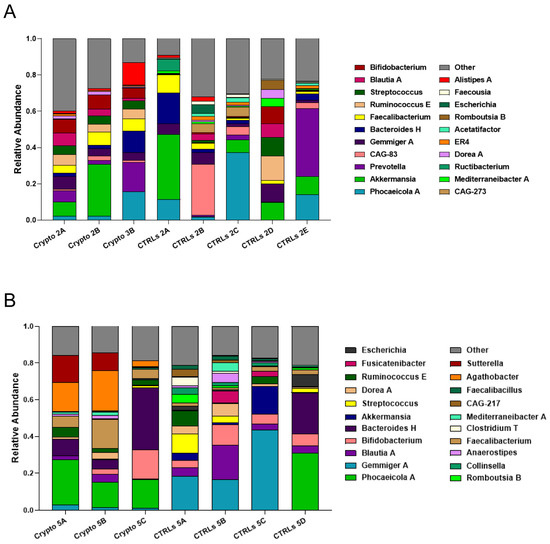 GM composition of patients with mild cryptosporidiosis. The GM of mildly affected patients are diverse and somewhat similar to that of their respective healthy CTRLs. (A,B) Stacked bar charts representing the relative abundance of bacterial genera in each Crypto 2 (A) and Crypto 5 (B) replicate and each individual age-matched CTRL. Genera detected under 1% relative abundance were grouped together and represented collectively as “other”.