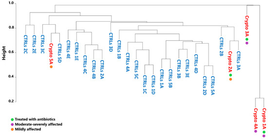 Beta-diversity analyses of Crypto-positive and CTRL samples. Dendrogram representing similarity between healthy CTRLs (blue) and a single sample from each Cryptosporidium-positive patient (red) as calculated by Bray–Curtis dissimilarity. Green: patients treated with antibiotics. Purple: patients with moderate–severe cryptosporidiosis. Orange: patients with mild cryptosporidiosis.