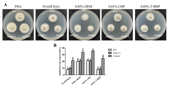 Chemical sensitivity assays revealed that ΔAacp1 was sensitive to oxidizing agents. Compared to the WT, ΔAacp1 showed significant difference in growth inhibition on PDA amended with hydrogen peroxide (H2O2), diethyl maleate (DEM), cumyl hydroperoxide (CHP), and tert-butyl-hydroxyperoxide (T-BHP) (Figure 2). As assayed on PDA, ΔAacp1 did not change sensitivity to sodium dodecylsulfate, Congo red, Sorbital, or NaCl (Figure S2).