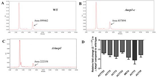 The WT, ΔAacp1, and ΔAacp1 were cultured in Richard’s medium for 24 days for ACT toxin production. Samples prepared from culture filtrates of the fungal strains and analyzed by HPLC revealed significant differences in the level of toxin production. ΔAacp1 reduced toxin production by 75% compared to the WT and ΔAacp1, based on peak areas (Figure 4A–C). Expression levels of ACTTS3, ACTT5, ACTT2, ACTTS2, META, ACTT2, and ACTTR were downregulated in ΔAacp1 compared to the WT (Figure 4D).