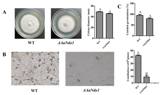Characteristics of AaNdo1 deficiency mutants. (A) Vegetative growth of A. alternata WT ΔAaNdo1 on potato dextrose agar (PDA) medium at 48 h. (B) Conidiation of WT and AaNdo1 on V8 juice agar and cultured at 26 °C for 7 days. (C) Conidial germination rate of WT and AaNdo1 strains. Conidial suspensions were sprayed on water agar and incubated at 26 °C for 12 h. Different letters indicate significant differences at p-value < 0.05.