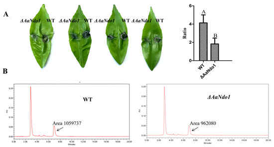 AaNdo1 is required for Alternaria alternata pathogenesis. (A) Virulence assays on citrus. Hongjv leaves were inoculated by placing mycelial mass prepared from WT and ΔAaNdo1 strains and maintained in a moisture plastic box for lesion development. The bottom panels are the percent changes in necrotic lesions of the leaves calculated in relation to the leaf area, which is also indicated. Different letters indicate significant differences at p-value < 0.05. (B) HPLC analysis of ACT toxin purified from culture filtrates of WT and ΔAaNdo1. The peak representing ACT toxin is indicated by an arrow.